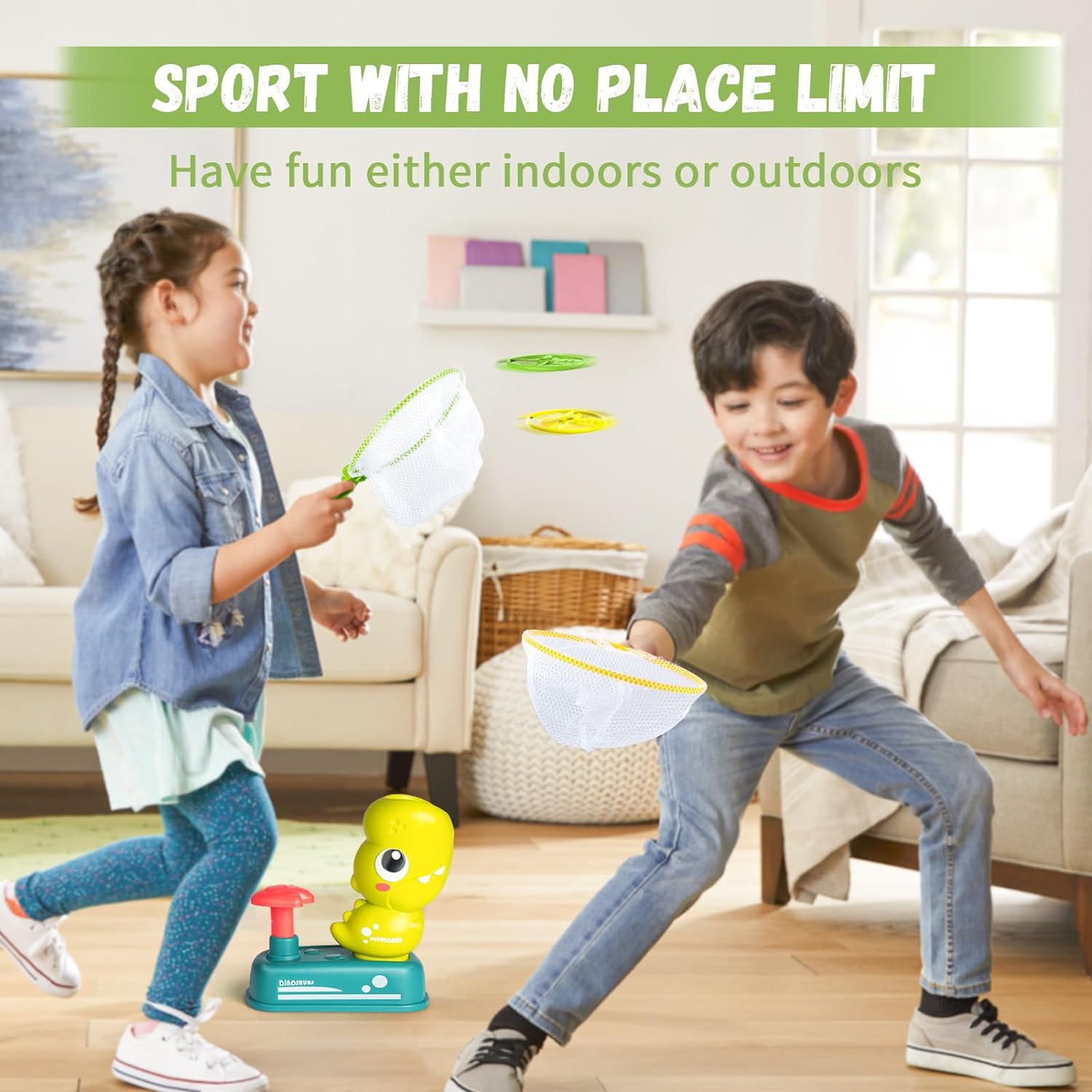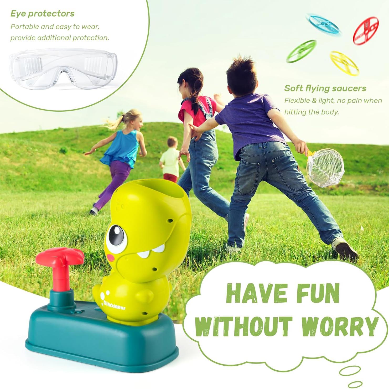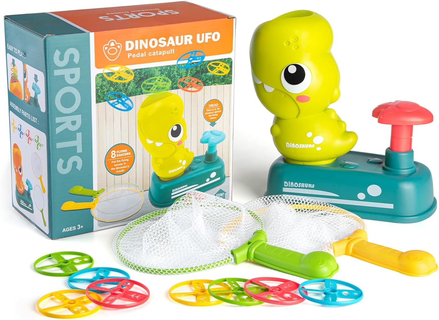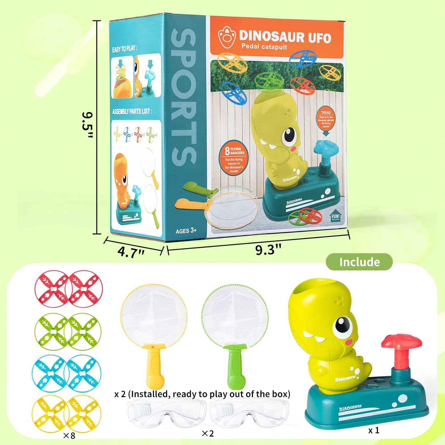 - 🎁READY TO PLAY RIGHT OUT OF THE BOX: Includes EVERYTHING you need: 1 dinosaur flying disc launcher, 2 assembled nets, 8 flying discs, 2 goggles for extra protection. Come and enjoy the simple game and endless fun!